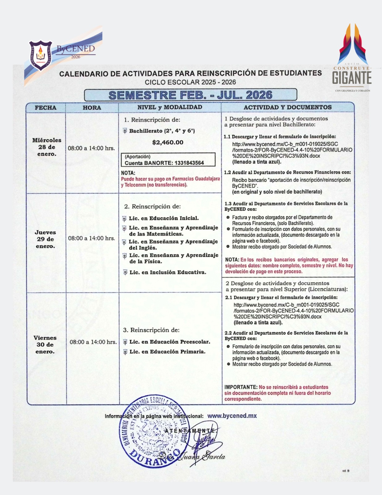 Compartir Twittear Proceso de Reinscripción al Semestre Febrero – Julio 2026 Publicado 1:58 pm por Recursos Tecnológicos ByCENED & archivado en Noticias, Titulares. Ficha para Licenciaturas: Descargar este Archivo (PDF) Ficha para Bachillerato: Descargar este Archivo (PDF)